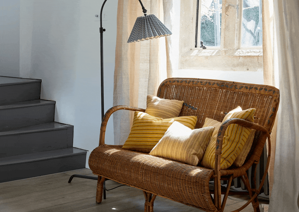 The full refurbishment of a Cotswold home known as The Old Forge, mixing traditional elements with a playful edge. Vinterior pieces include the rattan sofa, Swedish table and chairs, togo sofas and garden seating.